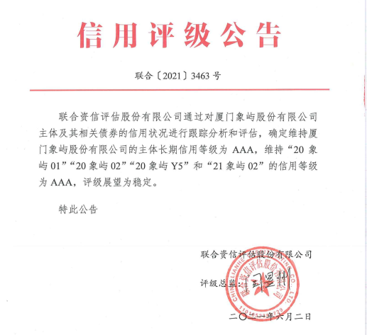 6月2日,權(quán)威評(píng)級(jí)機(jī)構(gòu)聯(lián)合資信評(píng)估股份有限公司(以下簡(jiǎn)稱“聯(lián)合資信”)出具《廈門(mén)象嶼股份有限公司公開(kāi)發(fā)行公司債券2021年跟蹤評(píng)級(jí)報(bào)告》,維持